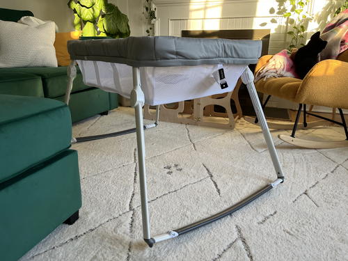 What I like about the Guava Lotus Bassinet is that it’s modern, and that it rocks gently. It has the perfect amount of rocking capability for a gentle sway for my newborn, with the frame and hinges.
