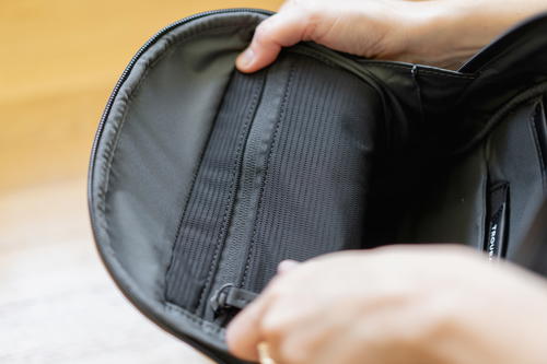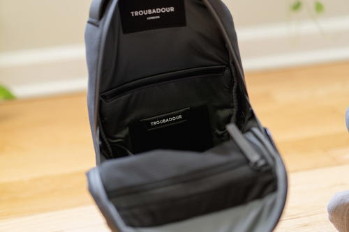 In the inside main cavity of the Apex Sling, I found a mesh zipper pocket for tech and accessories on the front panel, a mini tablet sleeve on the back panel, a flat organizer pouch for cards and a water bottle slip holder. That’s right: Troubadour bags have started getting designed with the water bottle sleeve holder inside to keep the look super minimalist on the outside.