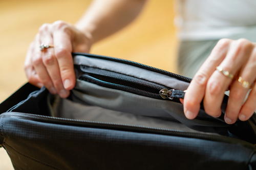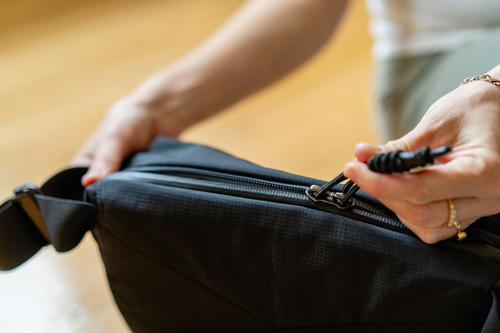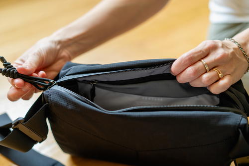 Instead of its zippers heading out from the center in either direction, it actually has two zippers that start on either side, and meet in the middle. While it takes getting used to, it’s cool! I don’t have any other sling bags or belt bags that work quite like the zippers on this one.