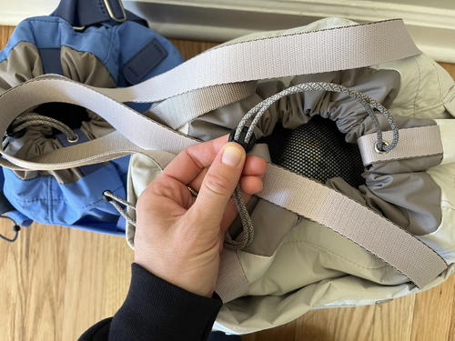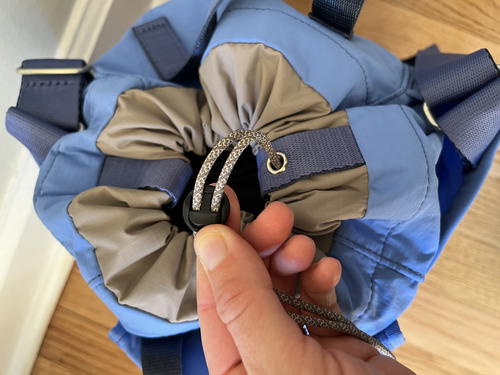 The “cinching” in the Cinch Collection is simple. These bucket bags and totes (and messengers, which I did not try) can be carried un-cinched, or cinched-up, meaning the drawcord is pulled in, to the center of the bag. This helps keep stuff inside, if you’re on a bumpy car ride, a day at the beach, a picnic in the park or even, using it as a personal item on an airplane.