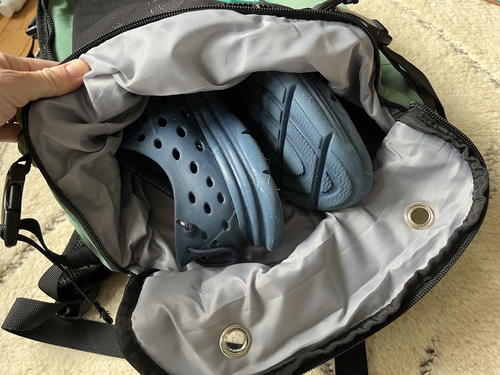 I find that when I put my shoes in (I wear a size 10, so my shoes are sizable), it eats up a lot of the space in the backpack.