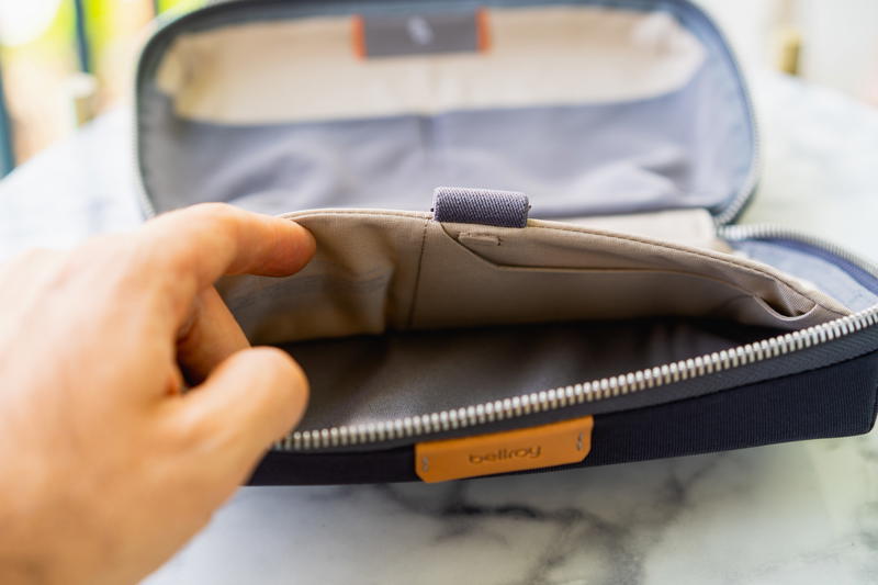 I’ve seen features like this before, and the way Bellroy’s floating wall works inside the tech bag is having it stretch out via elastic. On the divider wall itself, you’ll find a pull tab and a tiny pocket for small things like camera memory cards (and I travel with quite a few of those).