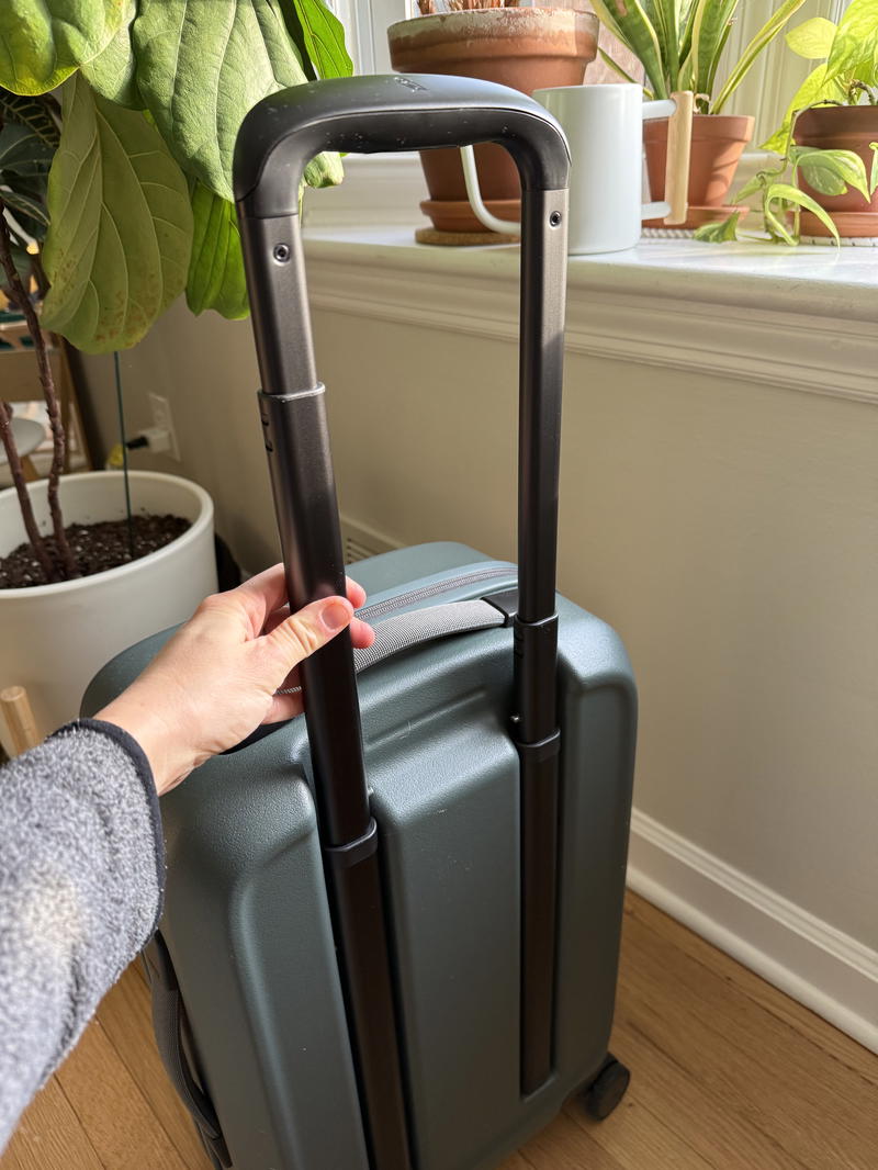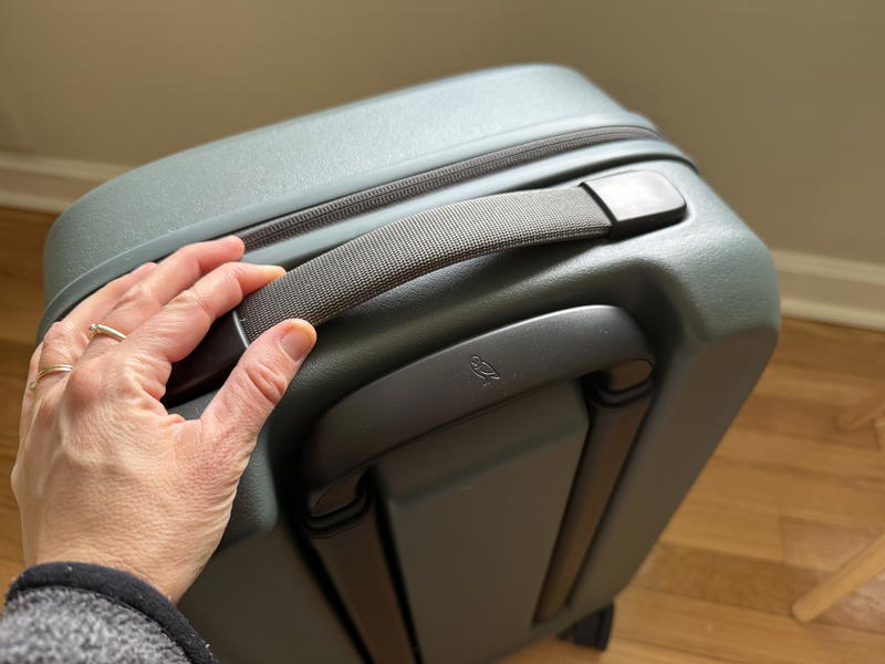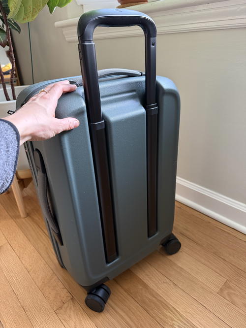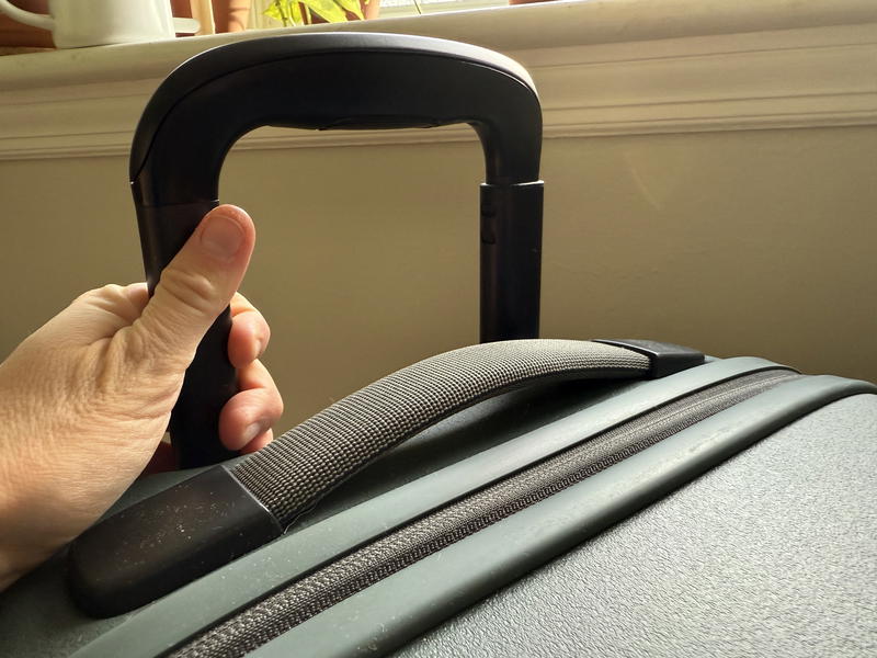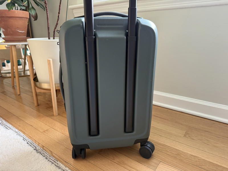 The handle adjusts to comfortable heights for different sizes of travelers. It feels solid when extended and doesn’t wobble or feel flimsy. Something specific to this carry-on is that the base of the handle is exposed on the backside, rather than hidden in.