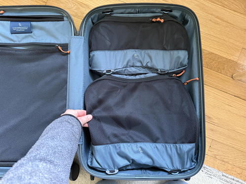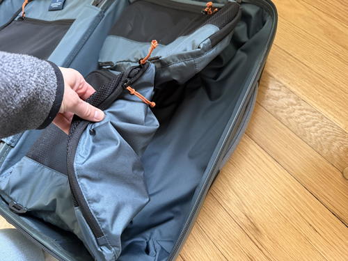 Basically, the right side (upon opening) features two built-in packing cubes. They are also removable. They hook in with a hook-and-loop style fastening. Both have zippers, and both work to compress what is packed under them, whether it is loose clothing items or more packing cubes that are flatter.