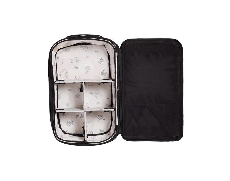 Some things that stand out about it are its ability to turn into a backpack with stowable straps, the interior main organizer (called the “Cubby”), which does away for most needs for packing cubes, the included (and matching) laundry bag and the COOL insulated pocket for cold snacks (or a baby’s milk bottle).