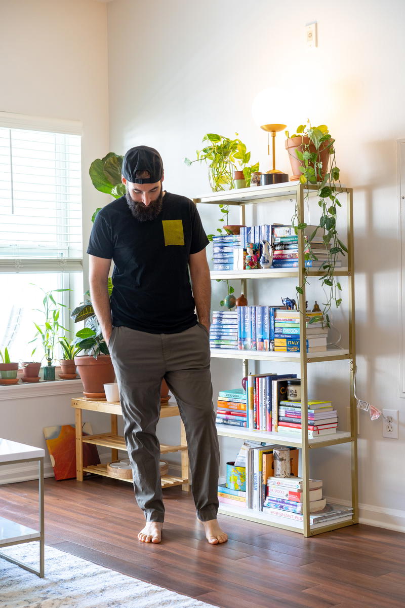 What’s the fit all about? These jogger-style pants are reminiscent of comfy jeans, actually, but with a drawstring waist and tapered leg. They are easy to pull on and take off, and are perfect as work-from-home or weekend pants. They’re perfect for wearing with a crewneck top like my Mott & Bow French Terry sweatshirt or a Mott & Bow Heavyweight Pocket Tee. If you’re looking for spring or summer pants, check out the Khaki color, which I think looks best with the casual cuff on the bottom.