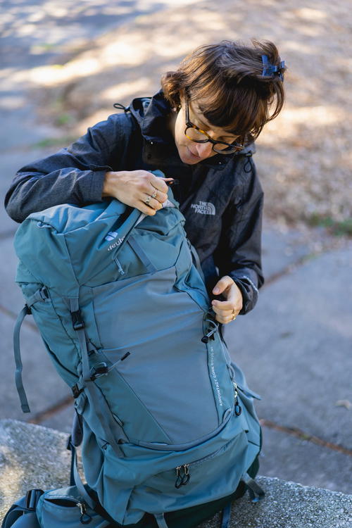 As a woman traveler using this backpack, I adjust the straps a lot. This backpack has great “expandability,” because it’s — well, expandable. The entire front of the bag unzips, which reveals another few liters of space that you can utilize. The exterior is 100% waterproof.