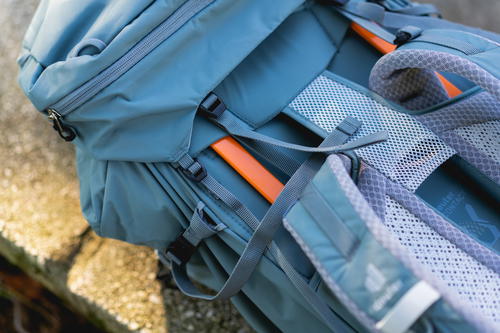 The backpack was modeled by Deuter to have a female-specific fit, setting it apart from a men’s bag of the same size and build. The “SL” in the name means “Slim Line.” For features, I like the ergonomic lock hip fit, with compression straps, an air mesh back panel and a narrow shoulder harness.