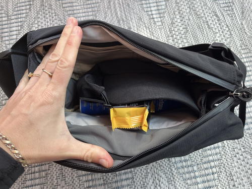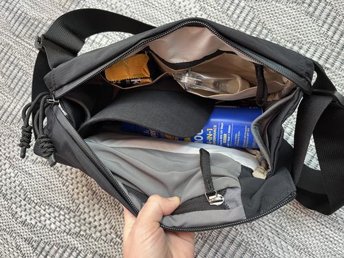 The other super handy feature to note is the elongated zipper pocket on the cushioned strap: it fits a granola bar or a pair of sunglasses. One more thing this sling bag has that others don’t is a water bottle pocket that fits even a wide-mouthed thermos!