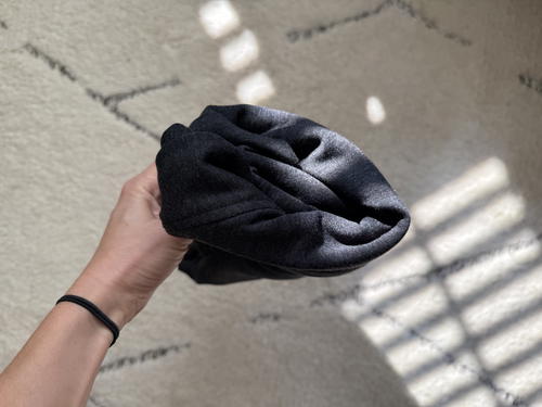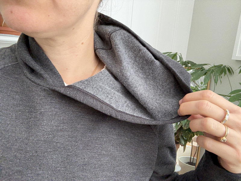 The hood is oversized and double-layered, which adds to the cozy factor, and I love the hand pockets hidden at the side seams. The ribbed cuffs stay in place and won’t ride up, which is a small detail that makes a big difference.