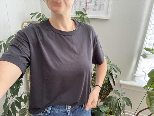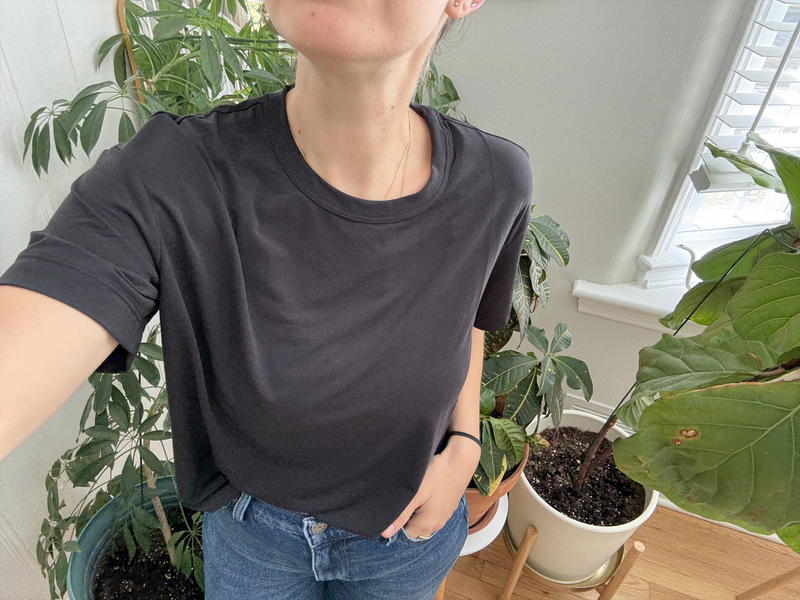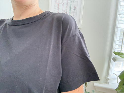 This tee is made to be loose, relaxed and semi-cropped. As someone on the shorter side, I find it’s most flattering when tucked into something high or mid-waisted—shorts, jeans or even leggings work great.