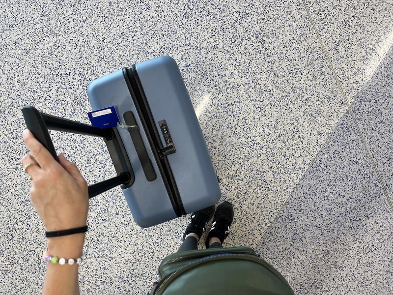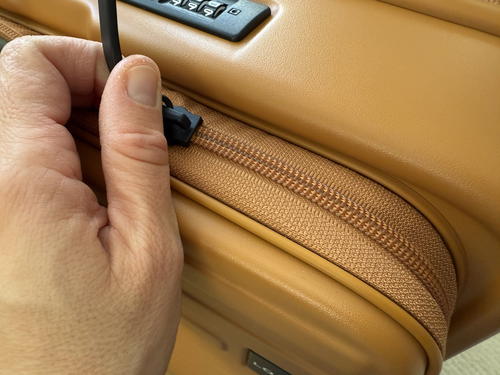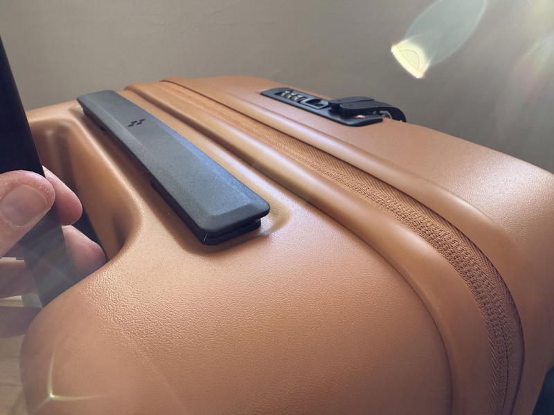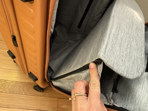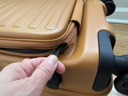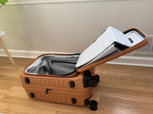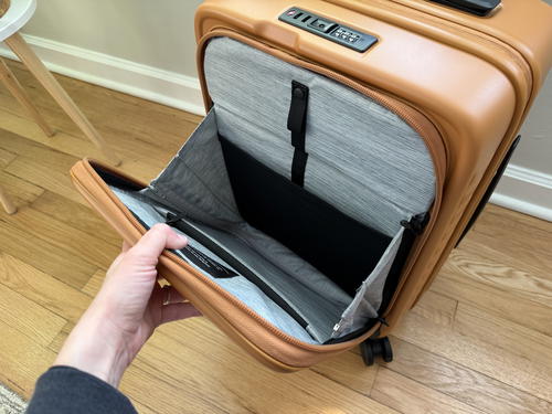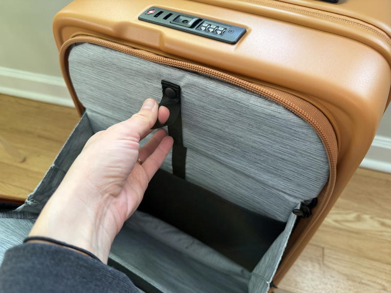 Right off the bat, the magnetic quick-access door is the showstopper. While it looks like a regular pocket, it’s actually a full compartment that can hold my laptop, laptop charger and headphones. And I can access them all without opening the suitcase with the zip-around zipper.