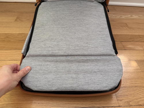 What this creates is a unique situation in which I don’t need to spread out with a giant footprint at the gate for my flight, if I realized, Oh shoot, I actually want to be wearing sweatpants, not shorts, for this flight. I don’t have to be that person laying my carry-on on the ground clamshell-style, taking up a ton of space and looking like a goofball. I can just zip open the front compartment and get into the stuff inside.
