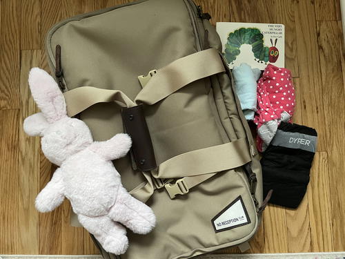 Update for 2025: The Hideaway Duffel has become my go-to for when my toddler needs her own bag packed for going away. In fact, when I think about packing, I visualize packing her things into the Hideaway Duffel, which does away with the need for packing cubes, and instead lays everything out in the “cubbies,” as you’ll see in the photos in this review. We took the Hideaway Duffel for her on a weekend away to the beach, and it performed great as a way to have all her stuff with her in her room, including the No Reception Club Dopp Kit.