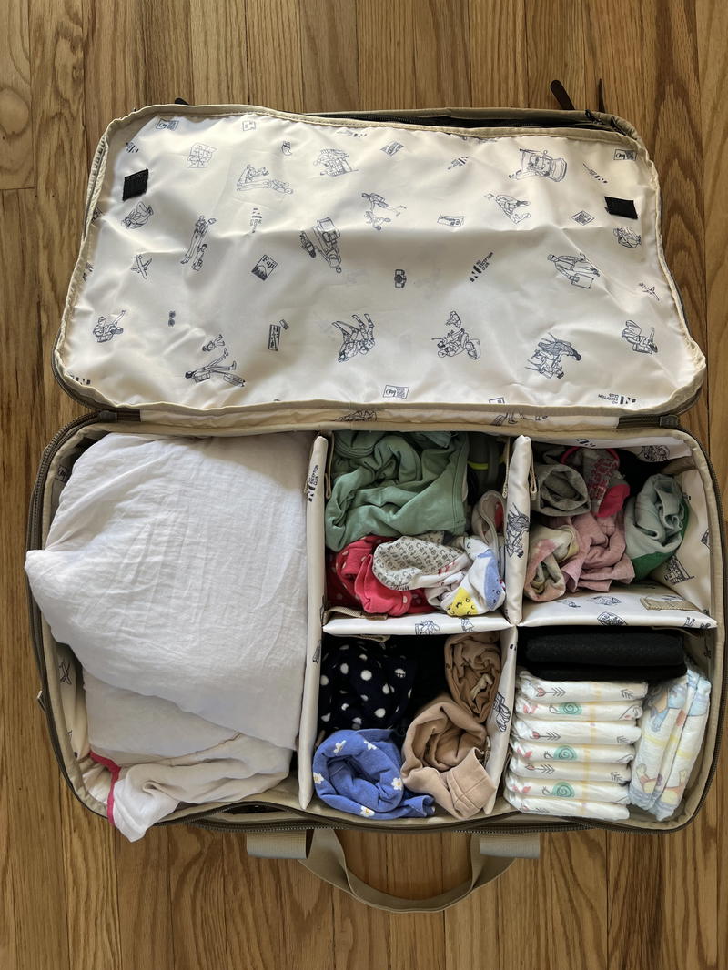 Right away, I liked the satisfaction of packing clothing neatly rolled into the cubby compartments, and using the large space leftover for something I really needed to fit in this duffel: a 2.5 TOG winter sleep sack (in size 24-36 months, so it was big!).