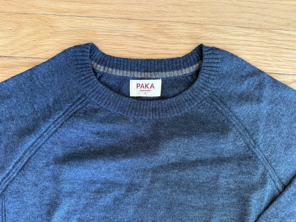 Like all PAKA products, the construction on the Ultralight Sweater is really nice: raglan sleeves with reinforced stitching, and tapered sleeves and bottom.