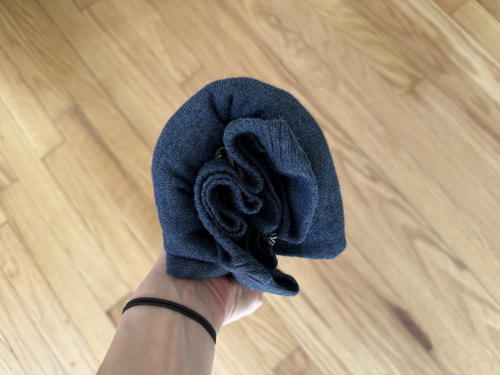 Having a sweater like the Ultralight Crew packed in my bags for shoulder season trips means much less bulk. You can see here how it wraps up and is a fraction of the size of a bulkier wool sweater that would typically come with me on a trip at the end of fall or during winter.