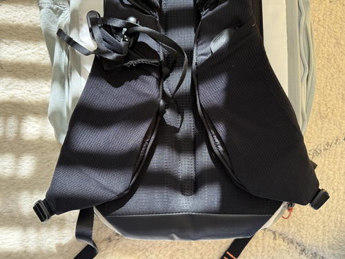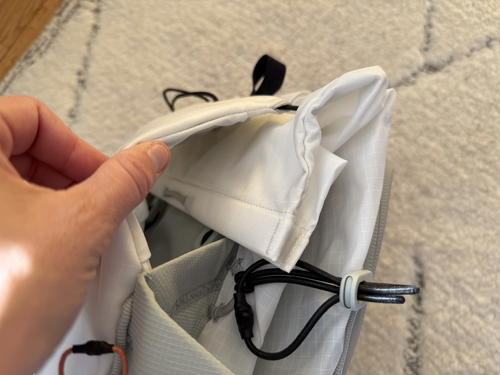 The materials feel complex in the best way possible. I’ll call it “mixed media” because there are so many different textures working together. You’ve got mesh pockets, weatherproof “Terra shell” ripstop fabric on the exterior, new nylon webbing on the back layers for ergonomic support, and these really cool drawstrings that add both function and visual interest.