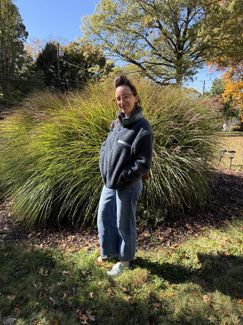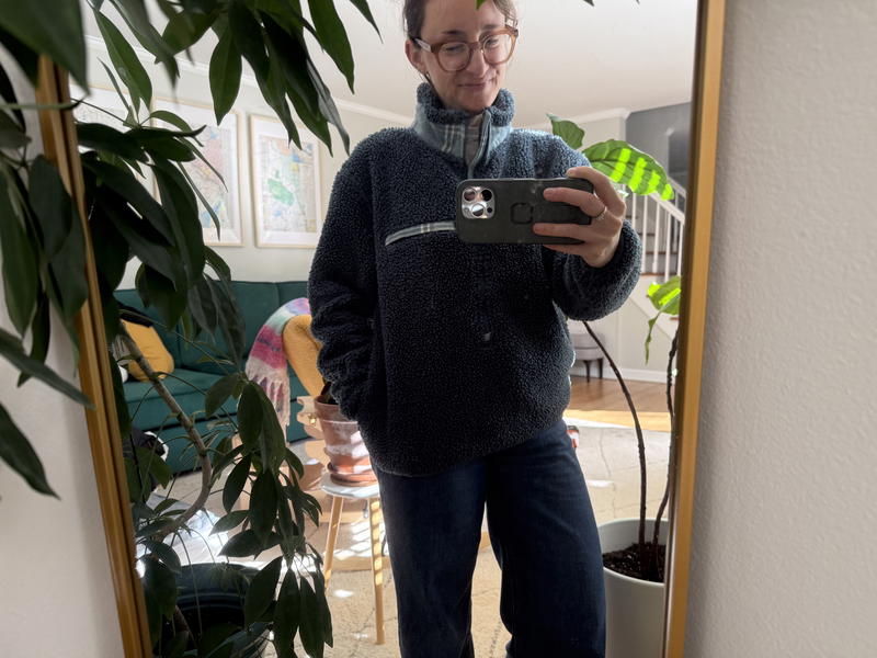 What I love about this fleece is that it’s a hybrid of a few things I adore. It’s a fleece, but it reminds me of that teddy material that’s used in so many coats these days. It’s a half-zip style that feels both like a sweater and a jacket, which honestly makes it perfect for those in-between weather days.