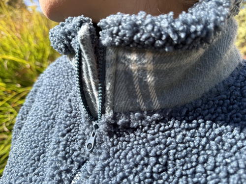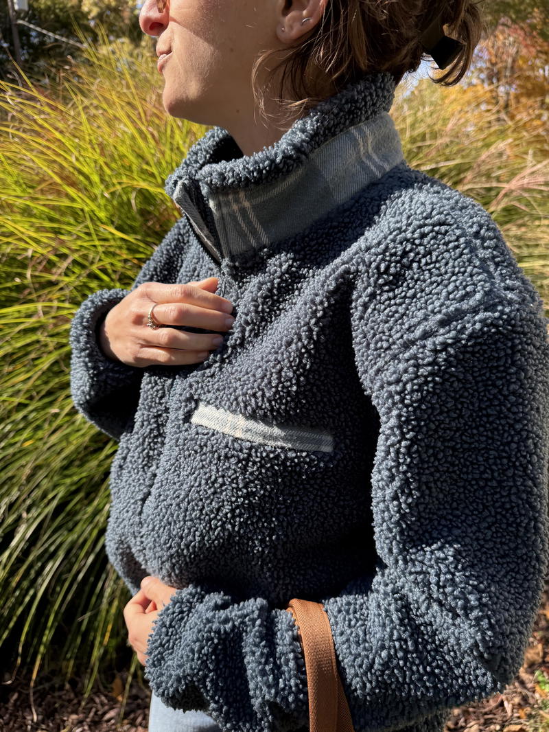 What sets this pullover apart? The signature plaid flannel lining on the flap of the zippered chest pocket and around the collar adds a unique, stylish twist to an otherwise solid-colored sherpa fleece. It’s those little details that make this fleece feel very “Pladra”.