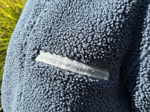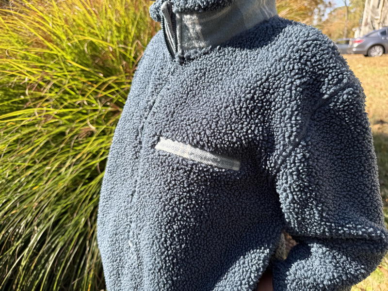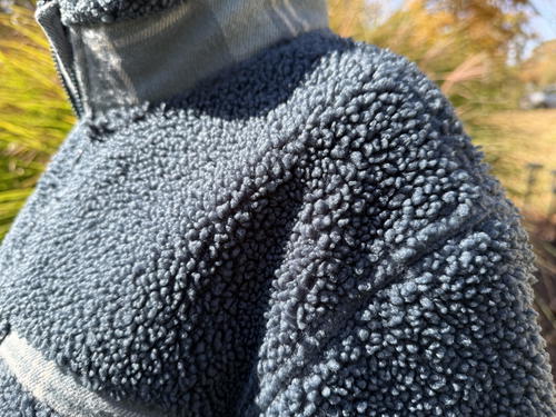 This is a heavyweight fleece. It feels even heavier and sturdier with more thickness than my North Face fleece jacket, and I think that says a lot. The fabric is 100% recycled polyester Sherpa fleece bonded to a classic fleece backer at 420gsm, which creates two distinct layers.