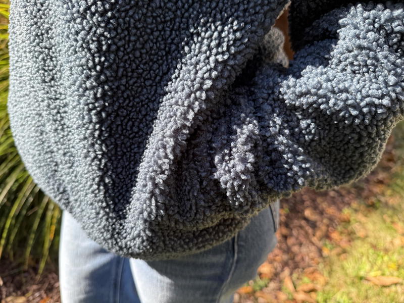 I will say, though, it’s not an “uncomfortable” type of oversizing for the Jenner Sherpa Fleece. I wear this and I’m not swallowed up by the sleeves, nor the length. Both feel good and undeniably cozy. The relaxed fit hits right at the waist, which works perfectly for layering over tank tops or long-sleeve tees.