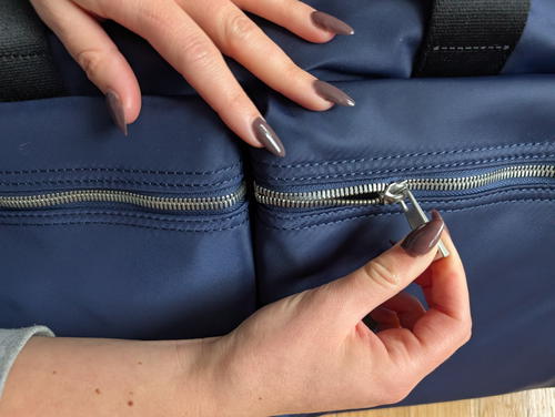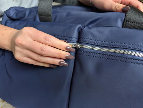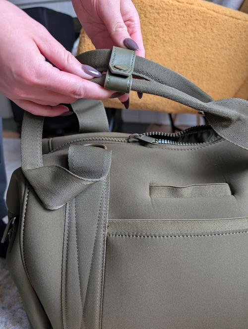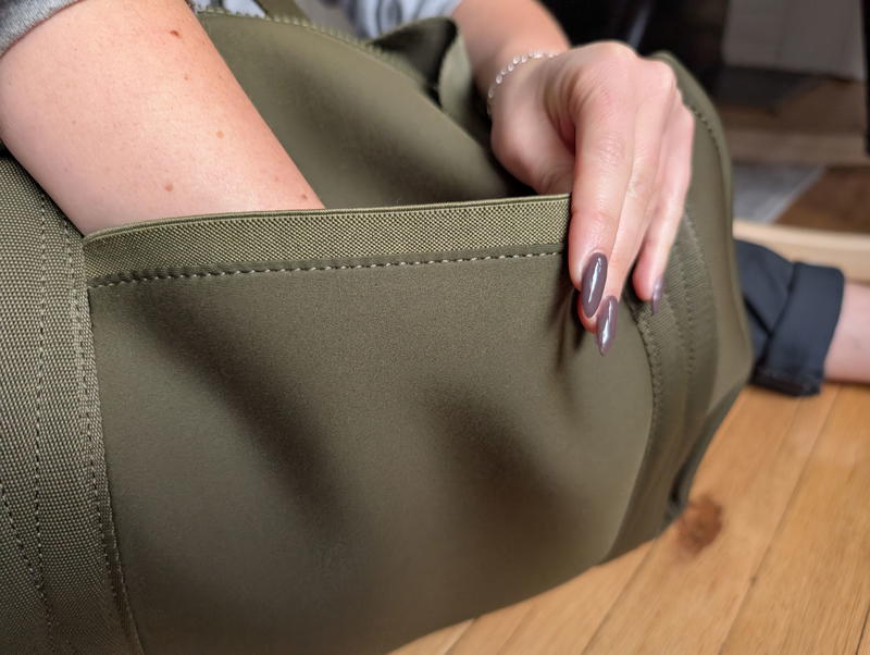 I’m calling them “fat” because I’m not sure how else to refer to the wide-toothed zippers that are snag-free. They feel signature to the neoprene travel bag style, which I suppose originated with the Dagne Dover bags. Quince pulled it off, though: the All-Day Neoprene Duffle Bag is easy to close and open, which is useful if you’re choosing it as a personal item for flight day.