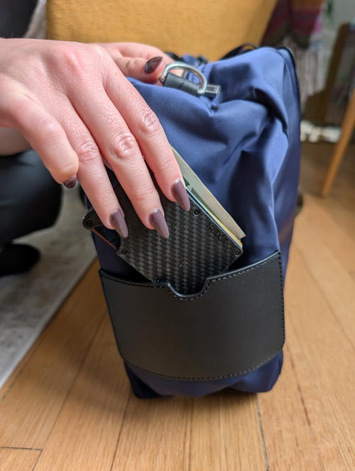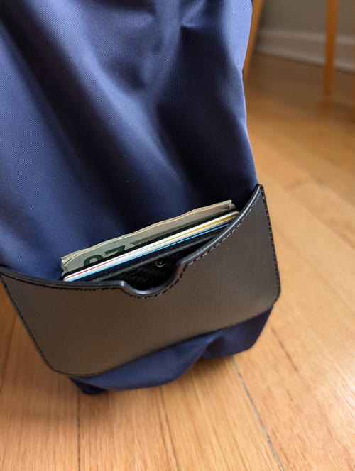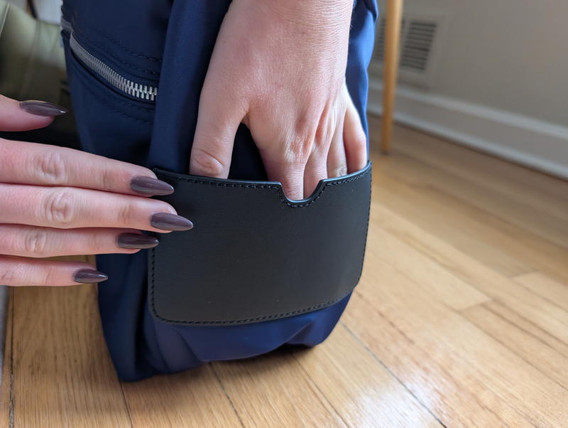 I was confused by this one. There’s an exterior pocket that’s flat, and kind of looks like it was made for holding a phone for a second, but it’s not very deep. I also wouldn’t put my wallet there, because it might fall out. It’s like a stash pocket for something flat or tiny (maybe a passport?) if I wanted to hold something there for just a moment.