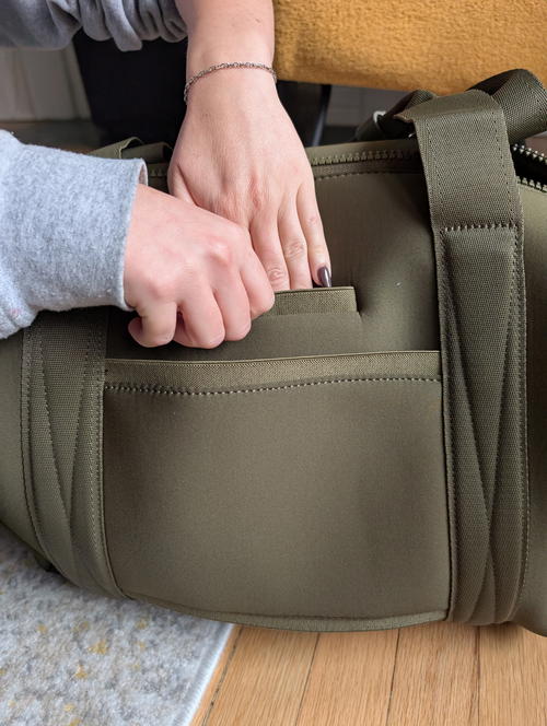 There’s a tiny phone (or wallet) pocket nestled on the exterior of this duffel, and I decided it’s ideal for when you’re going through passport control or security and you just need to stash your phone or wallet somewhere for a second. (For all other times, I’d probably not use a pocket this small, as something may fall out.)