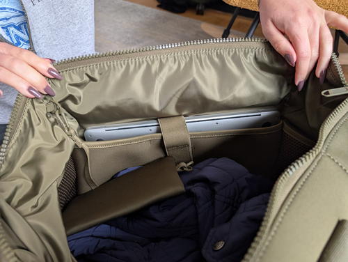 Let’s get my MacBook Air in here: it fits, and the Quince Neoprene Duffel fits “most laptops up to 16”.” That should work for the large majority of travelers.